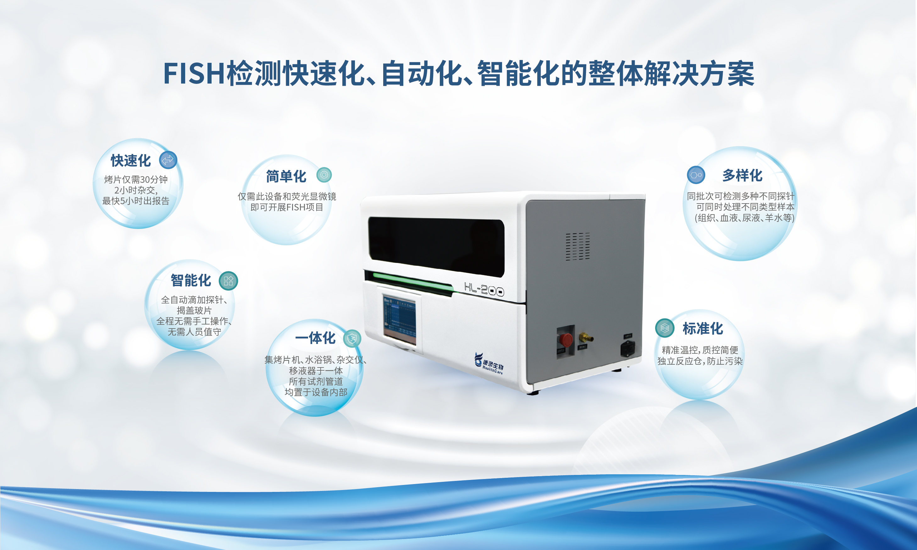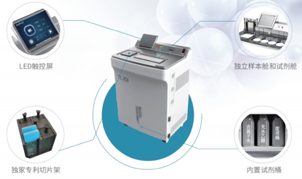 从组织白片到FISH染色完成,全程不需要人工干预,实现杂交前处理、微量添加探针(10ul/人份)、盖片封片和揭片、杂交后洗涤、添加DAPI等全流程自动化。
