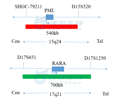 PML基因(15q24)标记为橘红色,长度为540kb; RARA基因(17q21)标记为绿色,长度为700kb。
