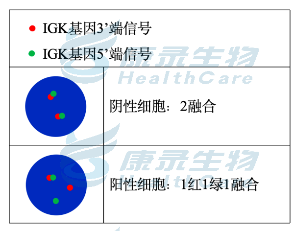 辅助诊断MYC::IGK融合的伯基特淋巴瘤; 伯基特(Burkitt)淋巴瘤(BL)是高度侵袭性的非霍奇金淋巴瘤(NHL),常发生在结外部位或表现为急性白血病。BL恶性程度极高,细胞倍增周期很短,生长迅速,若不及时治疗,患者可在数个月内死亡; 分子遗传学特点为MYC基因与IGH或IGK或IGL发生融合,此断裂探针用于判断是否发生IGK断裂;