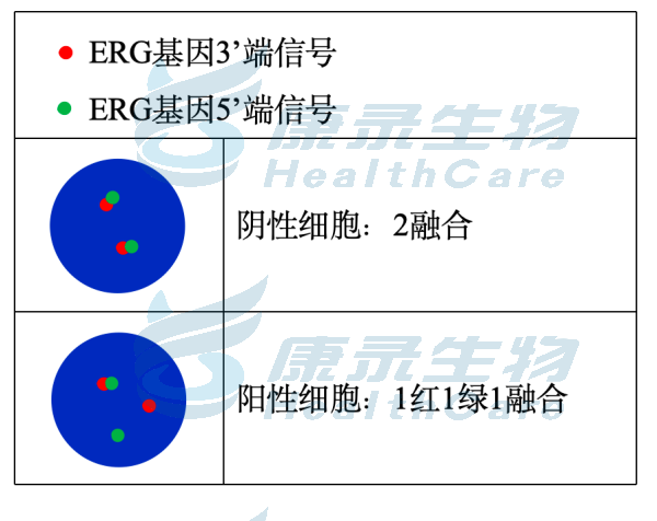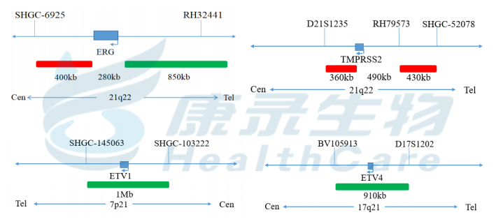 ERG基因3’端标记为橘红色,ERG基因5’端标记为绿色; TMPRSS2基因(21q22)标记为橘红色, ETV1基因(7p21)标记为绿色; TMPRSS2基因(21q22)标记为橘红色; ETV4基因(17q21)标记为绿色。