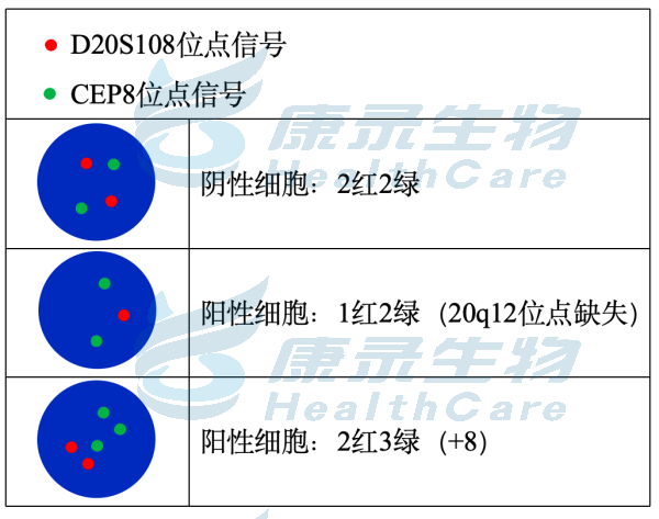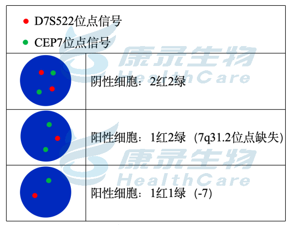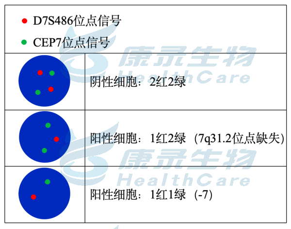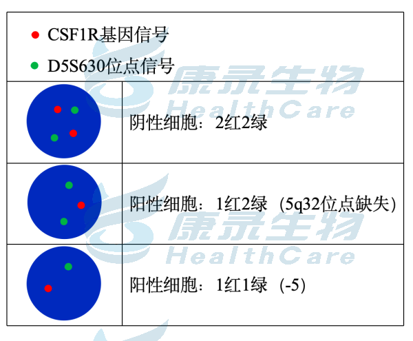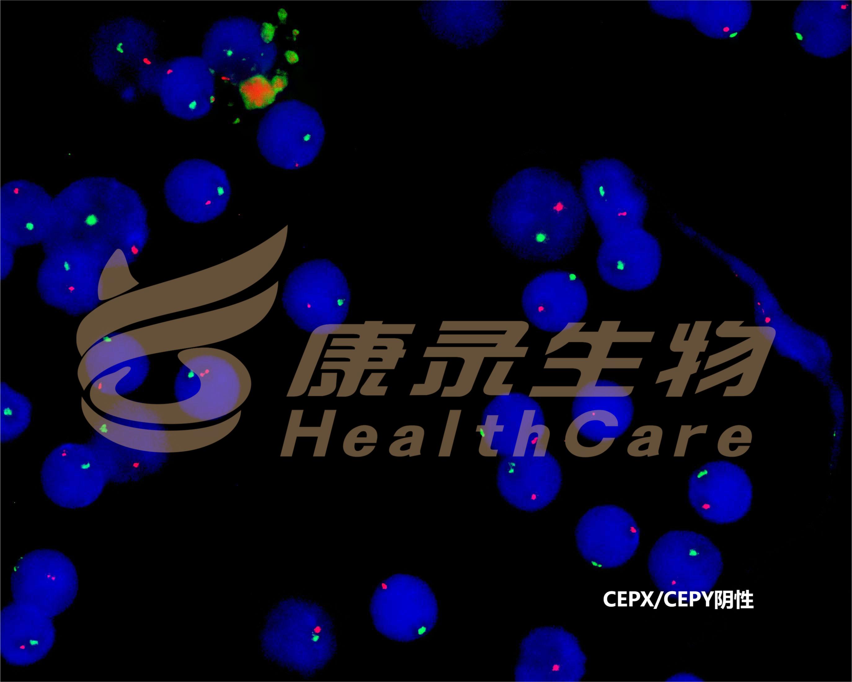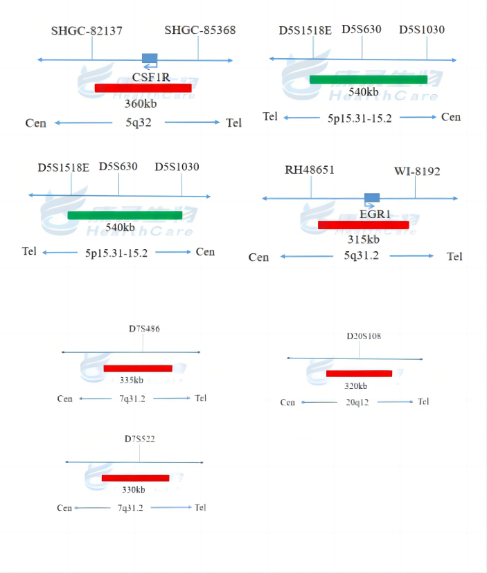 EGR1基因(5q31.2)标记为橘红色; D5S630基因位点(5p15.31-15.2)标记为绿色。 CSF1R基因(5q32)标记为橘红色; D5S630基因位点(5p15.31-15.2)标记为绿色。 D7S522基因位点(7q31.2)标记为橘红色; 7号染色体着丝粒(CEP7)标记为绿色。 D7S486基因位点(7q31.2)标记为橘红色; 7号染色体着丝粒(CEP7)标记为绿色。 D20S108基因位点(20q12)标记为橘红色; 8号染色体着丝粒(CEP8)标记为绿色。 Y染色体着长臂(CEPY)标记为橘红色; X染色体着丝粒(CEPX)标记为绿色。 X染色体着长臂(CEPX)标记为橘红色; Yq12段标记为绿色。