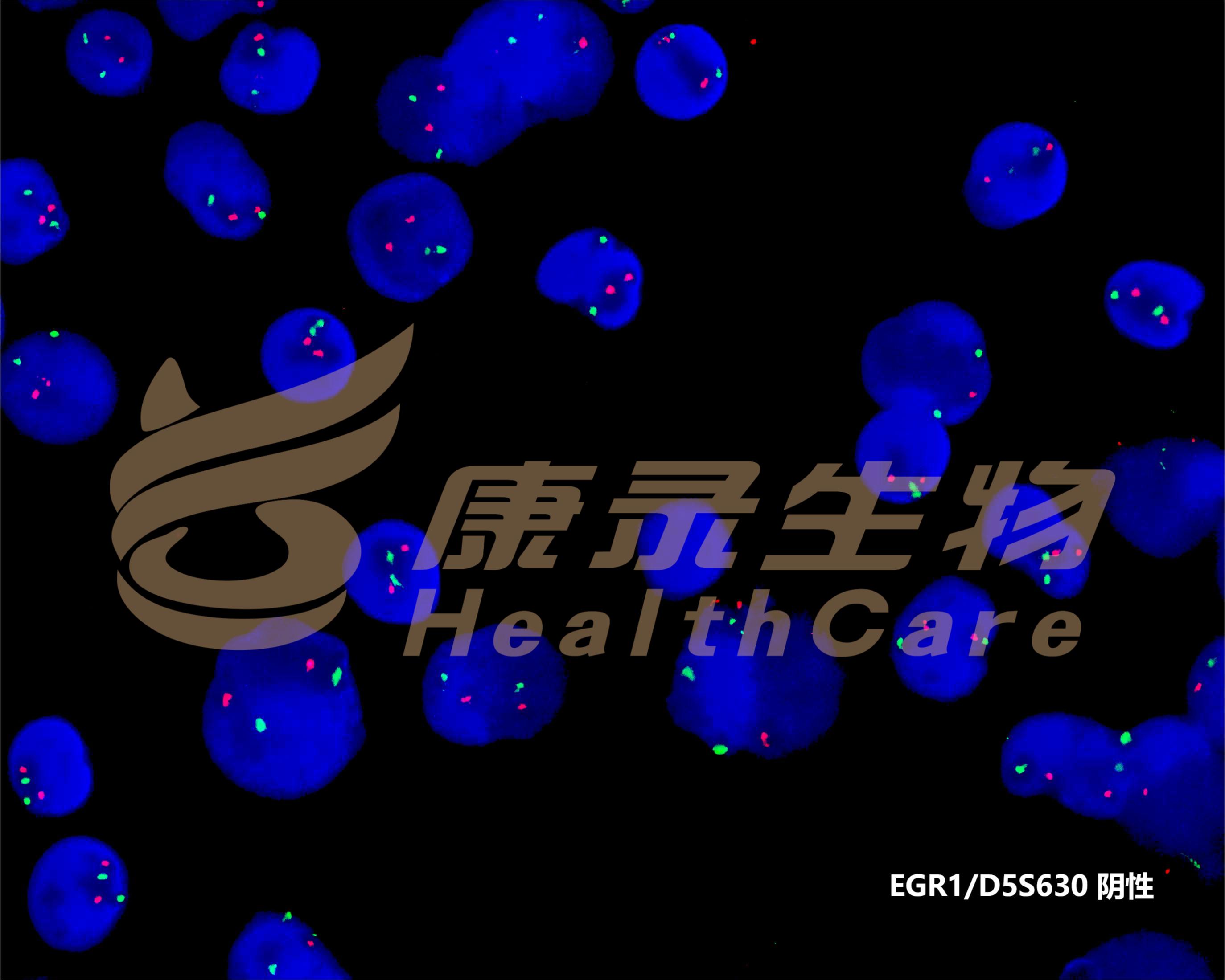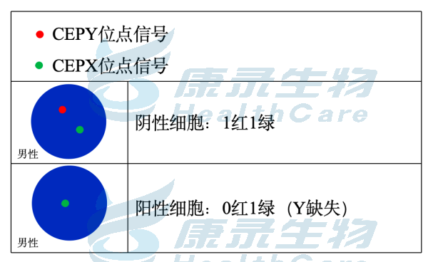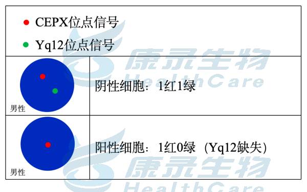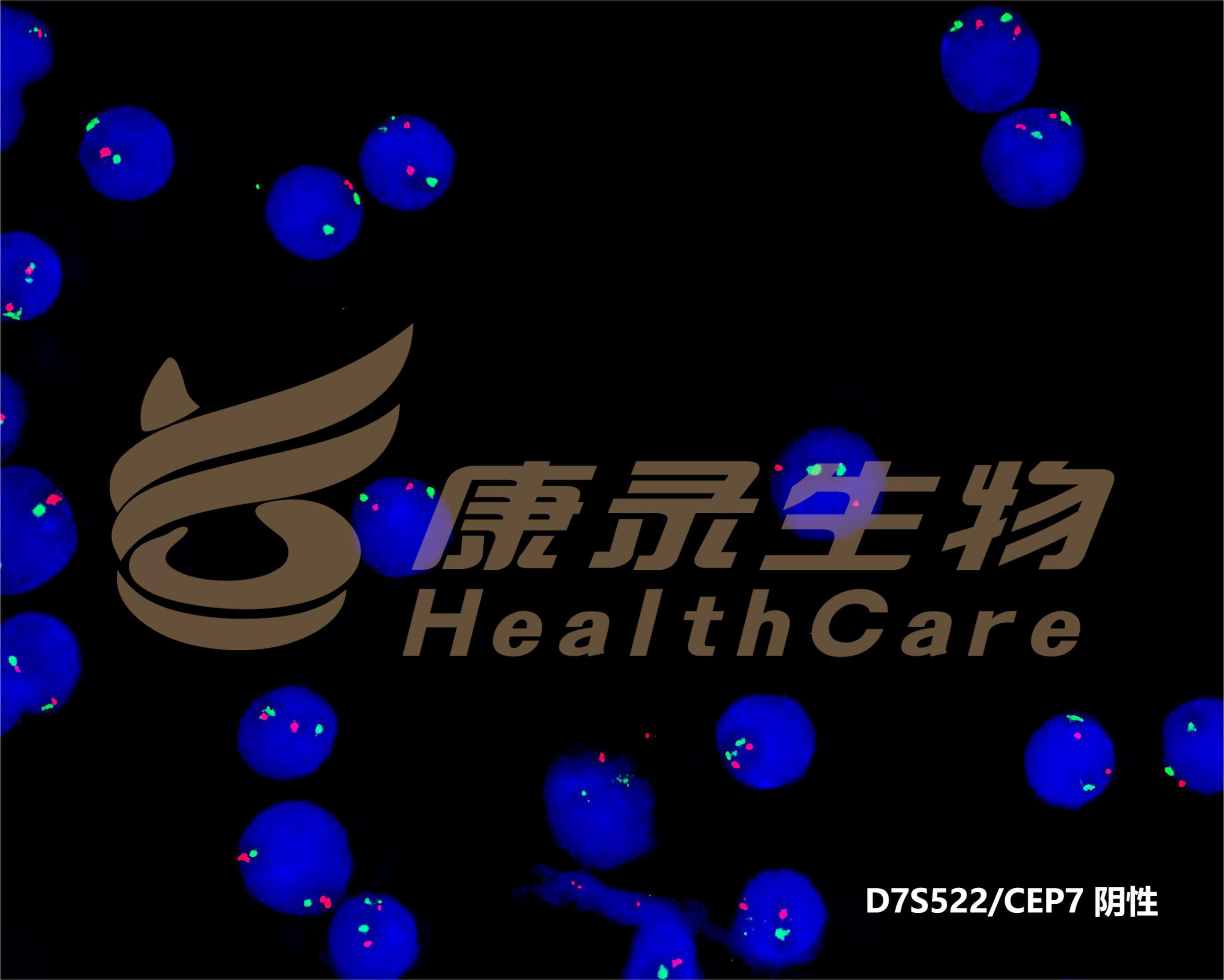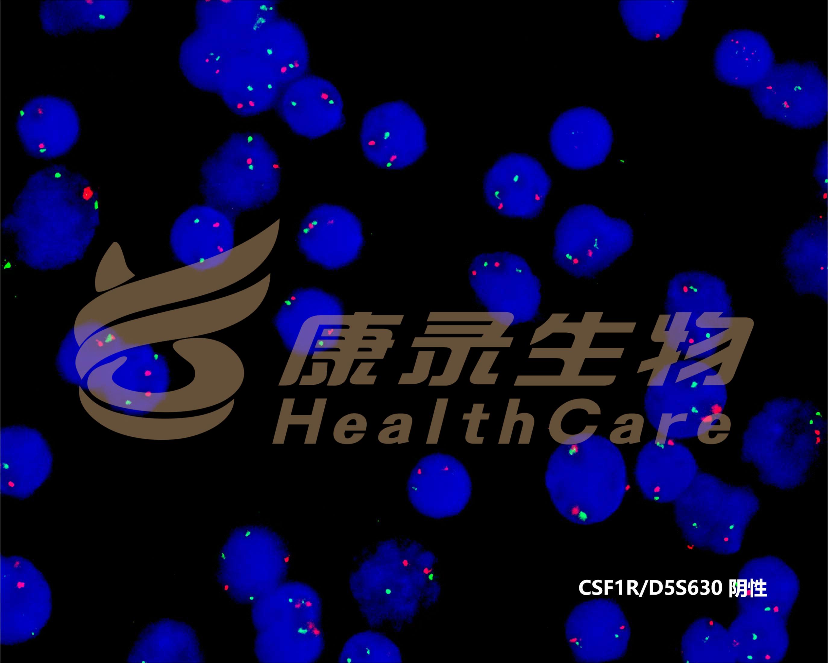 EGR1基因(5q31.2)标记为橘红色; D5S630基因位点(5p15.31-15.2)标记为绿色。 CSF1R基因(5q32)标记为橘红色; D5S630基因位点(5p15.31-15.2)标记为绿色。 D7S522基因位点(7q31.2)标记为橘红色; 7号染色体着丝粒(CEP7)标记为绿色。 D7S486基因位点(7q31.2)标记为橘红色; 7号染色体着丝粒(CEP7)标记为绿色。 D20S108基因位点(20q12)标记为橘红色; 8号染色体着丝粒(CEP8)标记为绿色。 Y染色体着长臂(CEPY)标记为橘红色; X染色体着丝粒(CEPX)标记为绿色。 X染色体着长臂(CEPX)标记为橘红色; Yq12段标记为绿色。