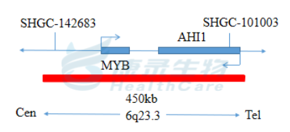 MYB基因(6q23.3)标记为橘红色; 6号染色体着丝粒(CEP6)标记为绿色。