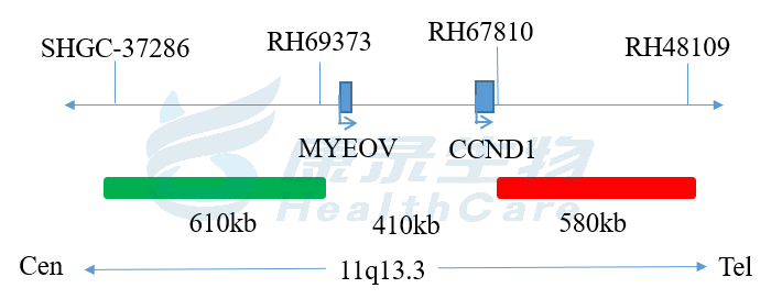 CCND1(BCL1)基因5’端标记为绿色; CCND1(BCL1)基因3’端标记为橘红色。