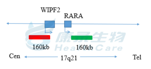 RARA基因5’端标记为橘红色; RARA基因3’端标记为绿色。