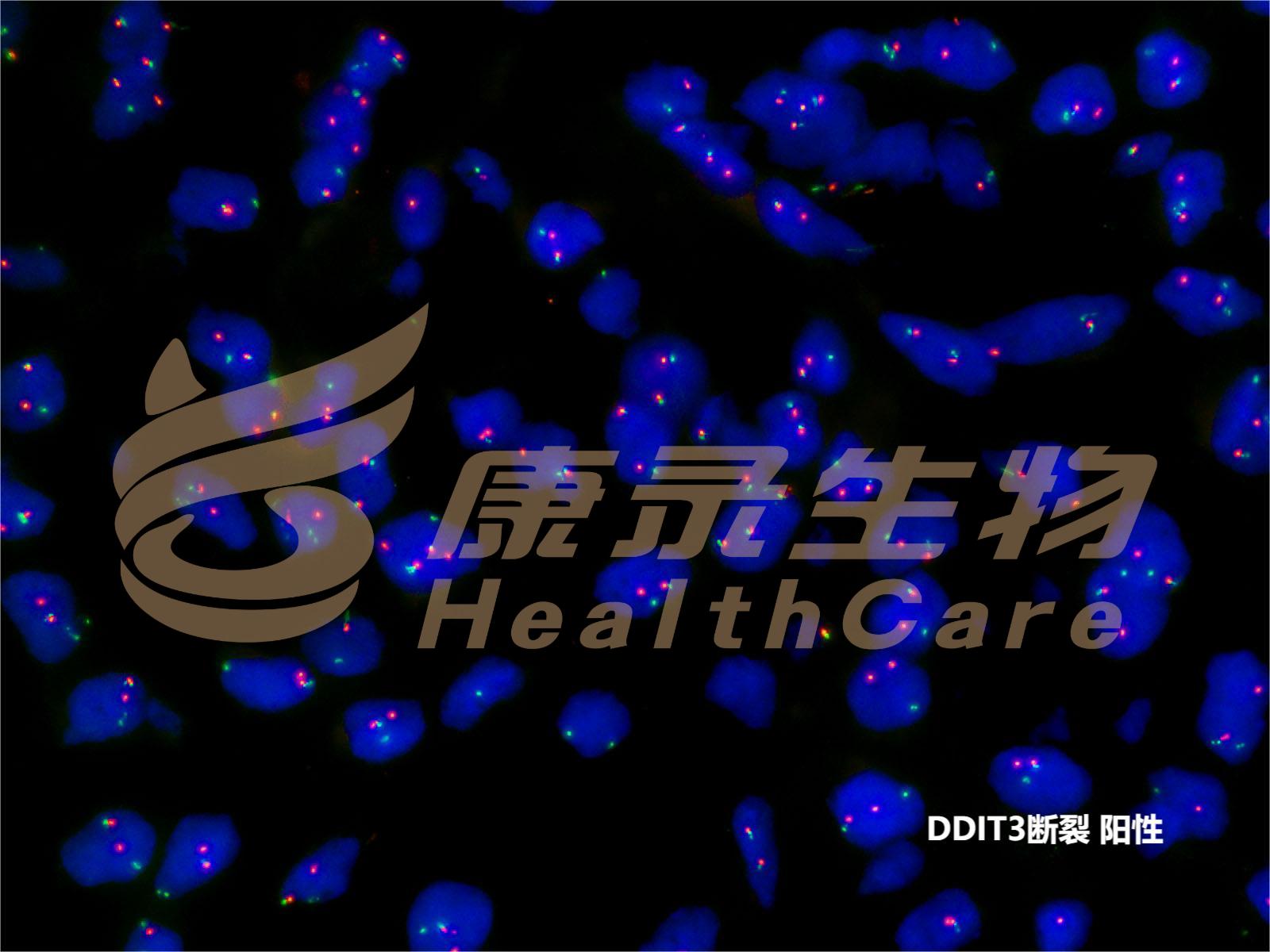 大于95%的黏液样脂肪肉瘤有特征性改变t(12;16)(q13;p11),导致产生DDIT3-FUS融合基因。DDIT3和MDM2在基因组中挨得很近,仅相距12M,如果检测DDIT3断裂为阴性但呈单色/双色扩增时应怀疑MDM2扩增,需用MDM2探针确认。