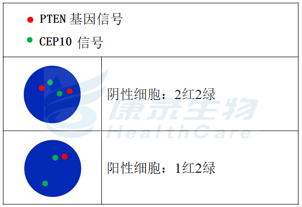 PTEN基因(10p23)标记为橘红色,长度为496kb; 10号染色体着丝粒(CEP10)标记为绿色。