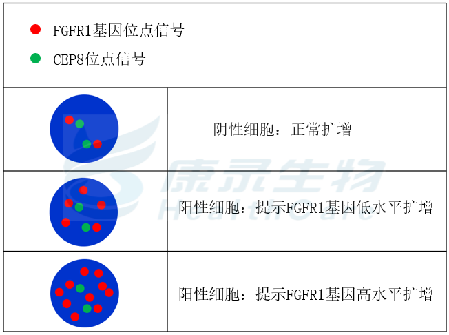 FGFR1基因(8p11)标记为橘红色; 8号染色体着丝粒(CEP8)标记为绿色。