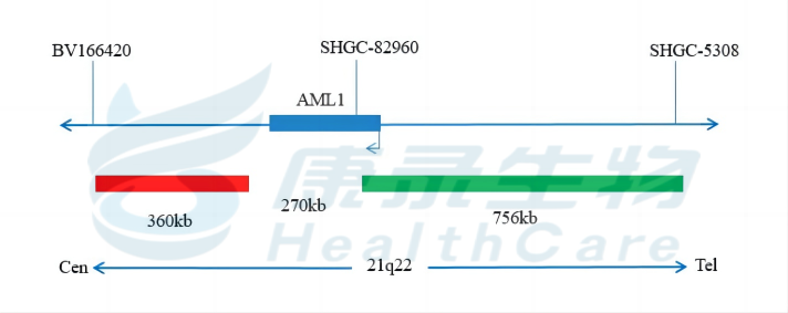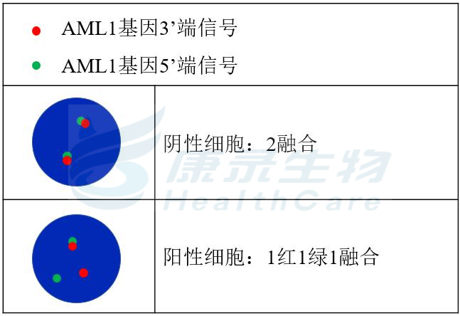 AML1基因3’端标记为橘红色; AML1基因5’端标记为绿色。