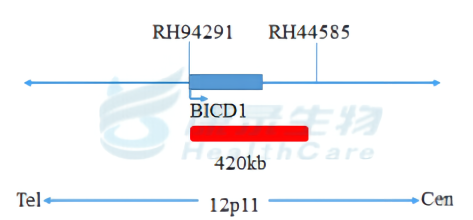 12p11段标记为橘红色; 12号染色体着丝粒(CEP12)标记为绿色。
