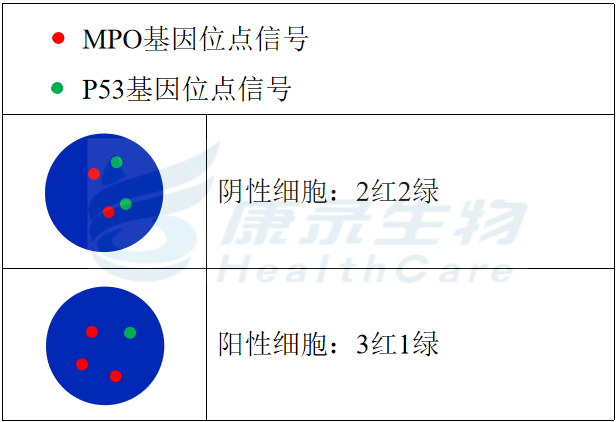 MPO基因(17q22)标记为橘红色; TP53基因(17p13.1)标记为绿色。