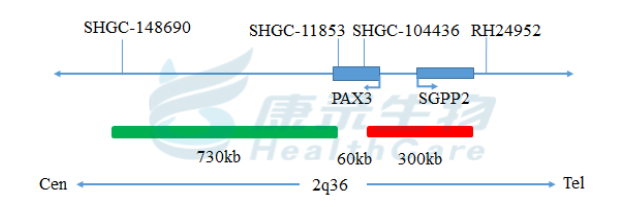 PAX3基因5’端标记为橘红色; PAX3基因3’端标记为绿色。