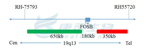 FOSB基因3’端标记为橘红色; FOSB基因5’端标记为绿色。