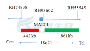 MALT1基因近着丝粒端标记为橘红色,长度为442kb; MALT1基因近端粒端标记为绿色,长度为861kb。