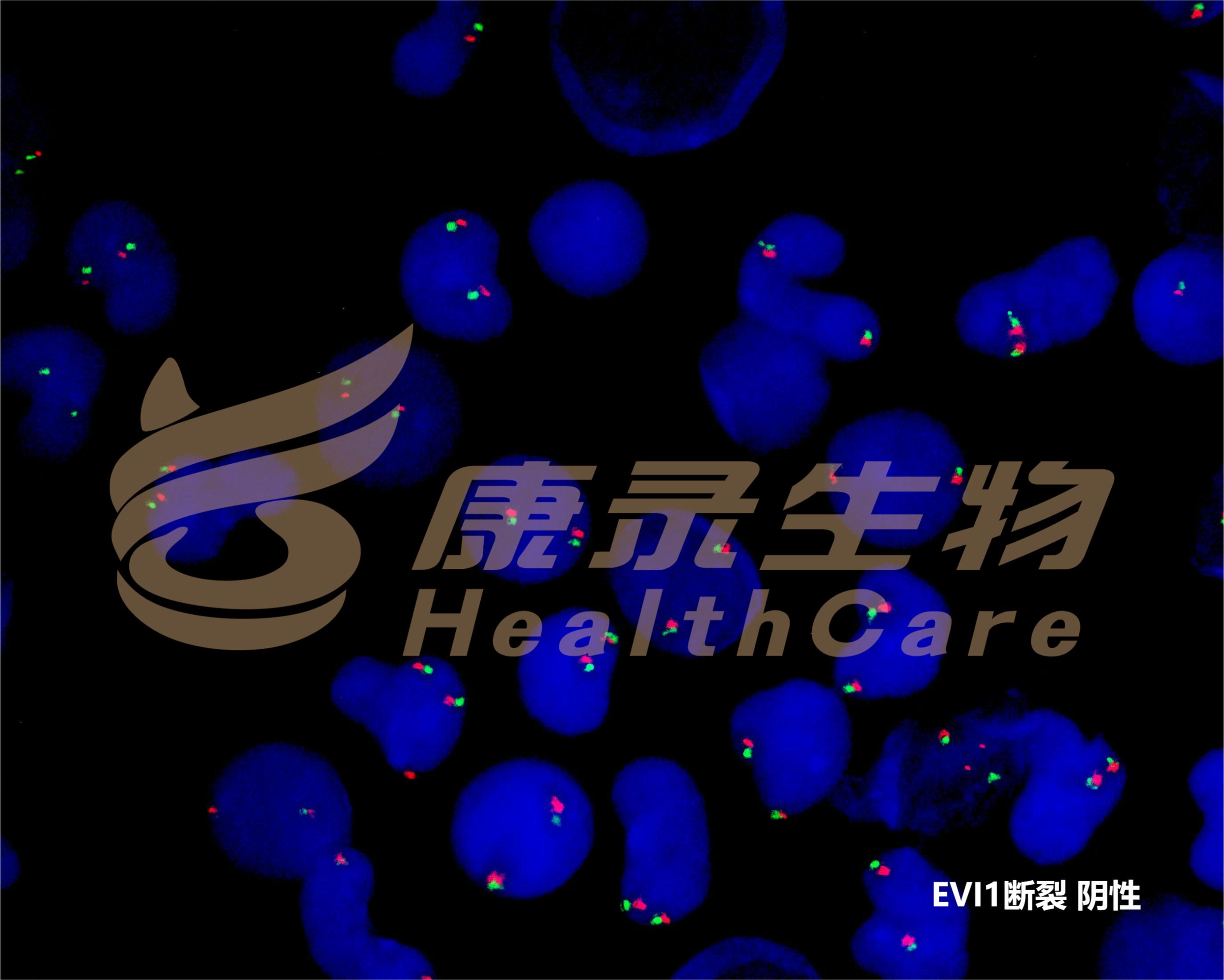 EVI1基因近端粒端标记为橘红色; EVI1基因近着丝粒端标记为绿色。
