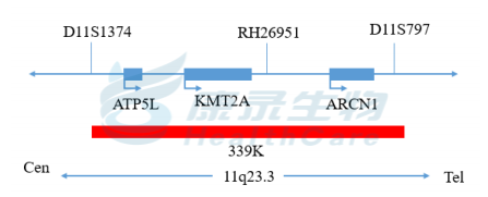 KMT2A(MLL)基因(11q23.3)标记为橘红色; 11号染色体着丝粒(CEP11)标记为绿色。