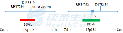 D13S319(13q14.2)标记为橘红色; p53基因(17p13.1)标记为绿色。