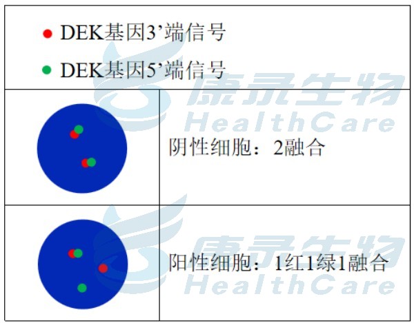 DEK断裂橘红色探针;DEK断裂绿色探针。