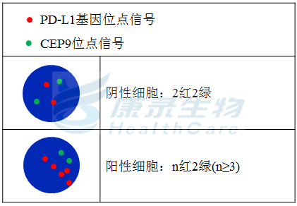 PD-L1基因(9p24.1)标记为橘红色; 9号染色体着丝粒(CEP9)标记为绿色。