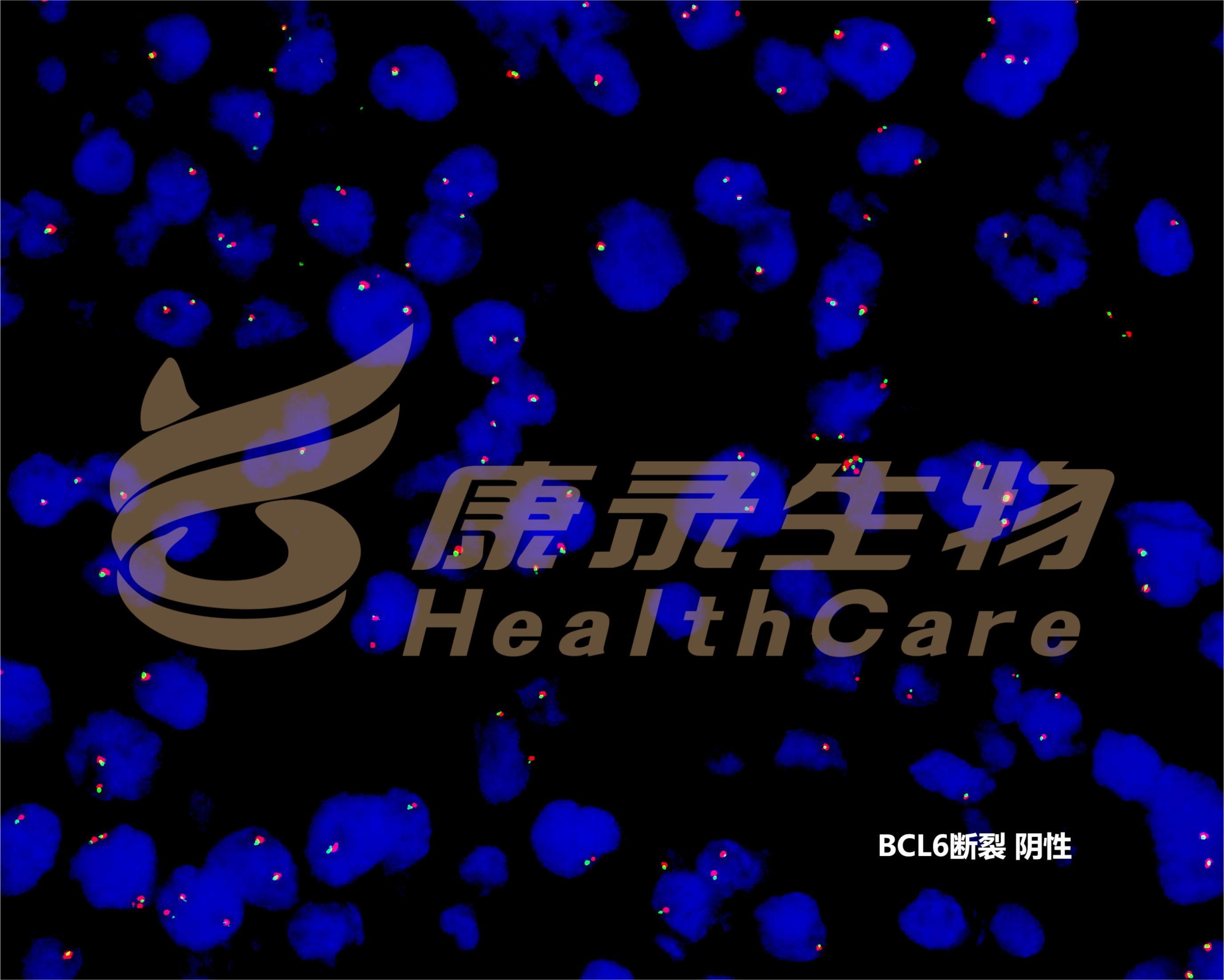 在弥漫性大B NHL中,BCL6 基因可与多种基因发生相互易位 ,发生率为20-40%;在滤泡性淋巴瘤中发生率为5-15%。 此探针用于检测BCL6基因是否发生断裂及易位,BCL6基因断裂是独立的评价生存率和康复率的检测指标。 BCL6基因断裂可与MYC基因断裂和BCL2基因断裂用于双/三重打击淋巴瘤的诊断。