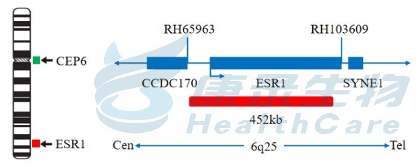 ESR1基因标记为橘红色;CEP6标记为绿色。