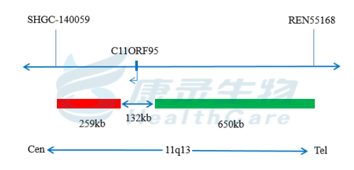 C11ORF95基因3’端标记为橘红色; C11ORF95基因5’端标记为绿色。