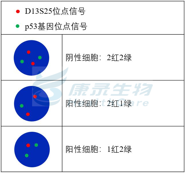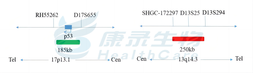 p53基因(17p13.1)标记为绿色,长度为185kb; D13S25基因(13q14.3)标记为橘红色,长度为250kb。