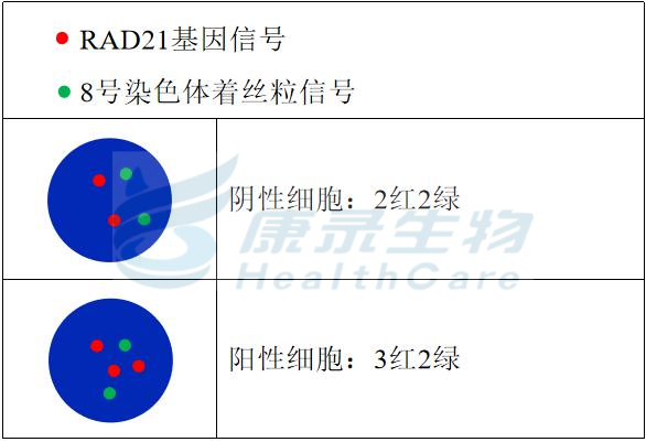 RAD21基因(8q23.3-24.11)标记为橘红色,长度为530kb; 8号染色体着丝粒(CEP8)标记为绿色。