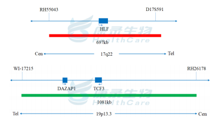 HLF基因标记为橘红色; TCF3基因标记为绿色。
