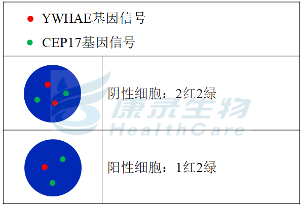 YWHAE基因橘红色探针;CEP17绿色探针。