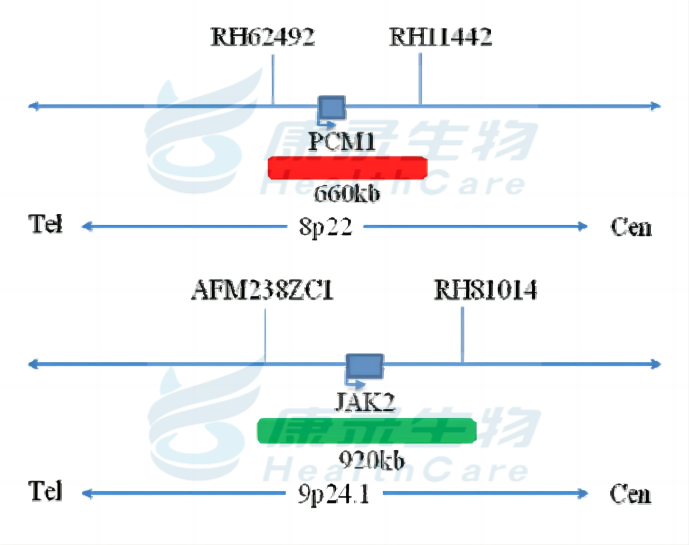 PCM1全长橘红色探针;JAK2全长绿色探针。