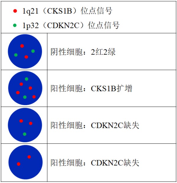 Gain/amp(1q21) (1q21+)是多发性骨髓瘤(MM)最常见的细胞遗传学异常之一,是MM重要的预后指标;1q21扩增往往与MM的浸润表型相关,预后差,疾病进展快;在16%MM中可出现1p32-36的缺失,此区域的缺失导致肿瘤抑制基因的丢失,导致出现增殖性疾病;本探针组合可检测1p32缺失及1q21区域扩增