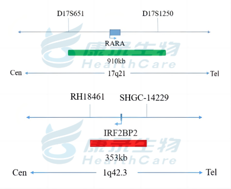 IRF2BP2橘红色探针;RARA全长绿色探针。