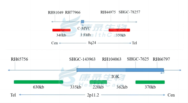 MYC全长橘红色探针;IGK全长绿色探针。