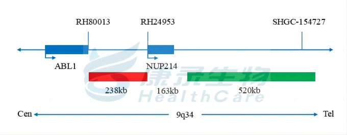 NUP214基因5'端标记为橘红色; NUP214基因3'端标记为绿色。