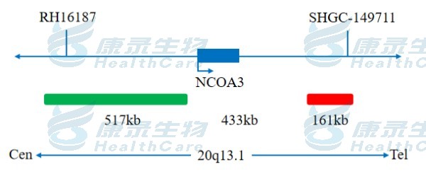 NCOA3 基因3'端标记为橘红色; NCOA3基因5'端标记为绿色。