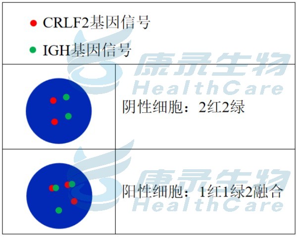 CRLF2全长橘红色探针;IGH全长绿色探针。