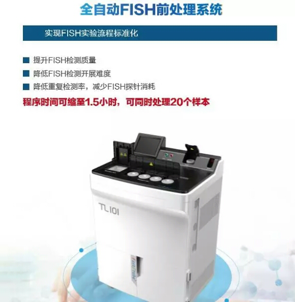 快速荧光原位杂交产品线包含全自动FISH前处理设备和快速荧光原位杂交探针,该产品线解决了FISH实验开展难,操作复杂繁琐等诸多临床问题。其中人类HER2基因扩增检测试剂盒及人类ALK基因融合检测试剂盒获得CFDA III类医疗器械注册证,TOP2A、TERC、MDS、CLL及膀胱癌快速FISH检测探针,获得CFDA I类医疗器械注册备案。