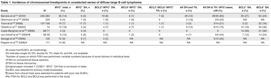 Lymphomas with recurrent chromosomal breakpoints activating multiple oncogenes, one of which being MYC, are often referred to as “Dual Hit” or “Double Hit” (DH) lymphomas. Rigorously, DH lymphoma is a rather imprecise term because, from the nomenclature point of view,it is neither restricted to B-cell lymphomas(eg,inv(14)-positive T-cell prolymphocytic leukemia may carry a MYC translocation) nor does it exclude 2 translocations activating oncogenes other than MYC (eg, a follicular lymphoma with simultaneous BCL2 and BCL6 translocation). Nevertheless, the term DH lymphoma is mostly used for mature-B-cell lymphomas with a chromosomal breakpoint affecting the MYC locus. For clarity, we will through the text apply a nomenclature, including the affected oncogenes, for example, BCL2 ? /MYC ? , and use the term DH lymphoma for all cases with multiple recurrent breakpoints (triple/quadruple) as well.