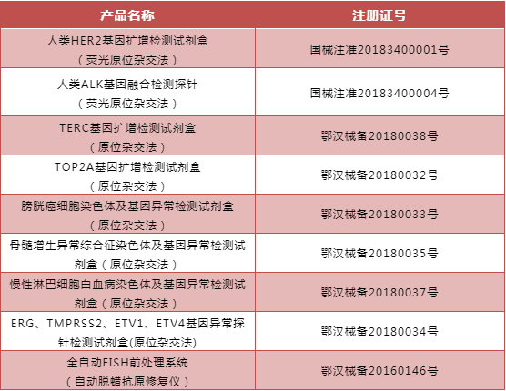 另外,人类HER2基因扩增检测试剂盒和人类ALK基因融合检测探针获得CFDA III类医疗器械注册证,是全球范围内较早投入临床检测市场的快速FISH探针,TOP2A、TERC、MDS、CLL及膀胱癌快速FISH检测探针,获得CFDA I类医疗器械注册备案证。