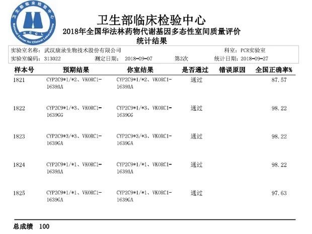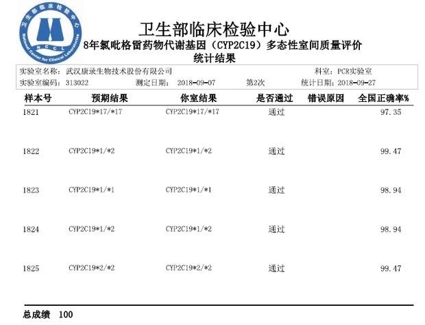 热烈祝贺6776永利集团(以下简称“6776永利集团”)在2018年NCCL第二次室间质评项目中,斩获两项满分!检测项目包括氯吡格雷和华法林药物代谢基因多态性检测室间质评。