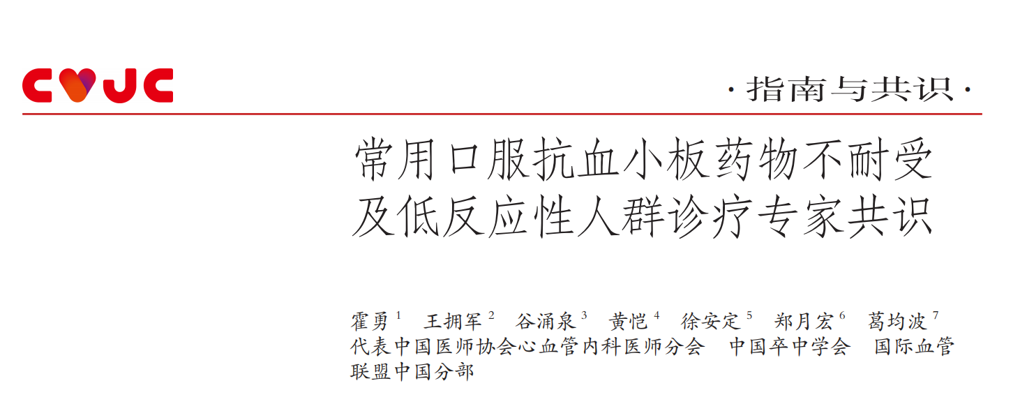 早期大量临床研究证实抗血小板治疗对于动脉粥样硬化性心血管疾病的一级和二级预防有显著益处,抗血小板药物在冠状动脉粥样硬化性心脏病(以下简称冠心病)、缺血性脑血管疾病和外周动脉疾病(peripheralarterial disease,PAD)的治疗中得到广泛运用,尤其对急性冠状动脉综合征(acutecoronary syndrome,ACS)和置入药物洗脱支架(drugeluting stent,DES)的患者,国内外指南均将双联抗血小板治疗(dualantiplatelet therapy,DAPT)作为Ⅰ类推荐。然而,抗血小板治疗的疗效和安全性呈现较大的个体差异,在许多患者中出现不耐受情况,包括导致或加重消化道损伤及出血、其他器官部位出血和高尿酸血症/痛风等;此外,因患者对药物反应性低而增加抗血小板药物治疗剂量所导致的上述不良反应也屡见不鲜。因此,对于抗血小板药物不耐受高风险人群的识别,对于各类常规抗血小板治疗出现不耐受及低反应时的临床决策,亟须具体指导性意见。故而,由中国医师协会心血管内科医师分会、中国卒中学会和国际血管联盟中国分部发起,根据近年国内外动脉粥样硬化性疾病抗血小板治疗临床研究成果,结合我国临床现状和从业专家的临床经验制定此共识。希望通过本共识的制定与应用,为优化临床抗血小板药物不耐受及低反应性患者的诊疗提供指导。