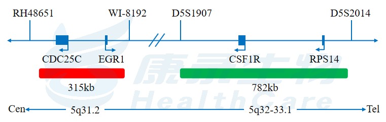 del(5q)是MDS/AML的常见染色体异常,EGR1和CSF1R探针分别覆盖5q31和5q33的两个常见缺失区域。在MDS、AML 等髓系恶性肿瘤、肺癌和其他几种癌症类型中已观察到CSF1R异常和EGR1异常。