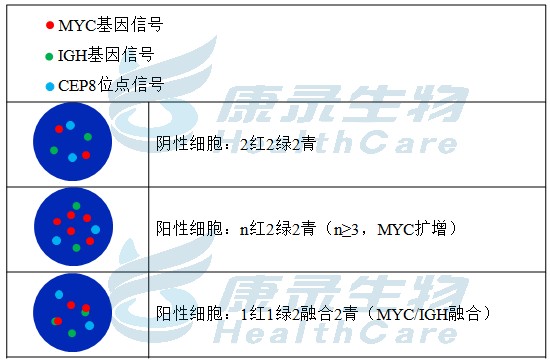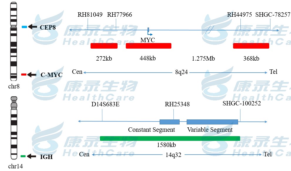 C-MYC全长橘红色探针;IGH全长绿色探针;CEP8青色探针