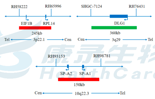3p22.1/3q29双色探针:3p22.1橘红色探针;3q29绿色探针。 10q22.3/CEP10双色探针:10q22.3橘红色探针;CEP10绿色探针。