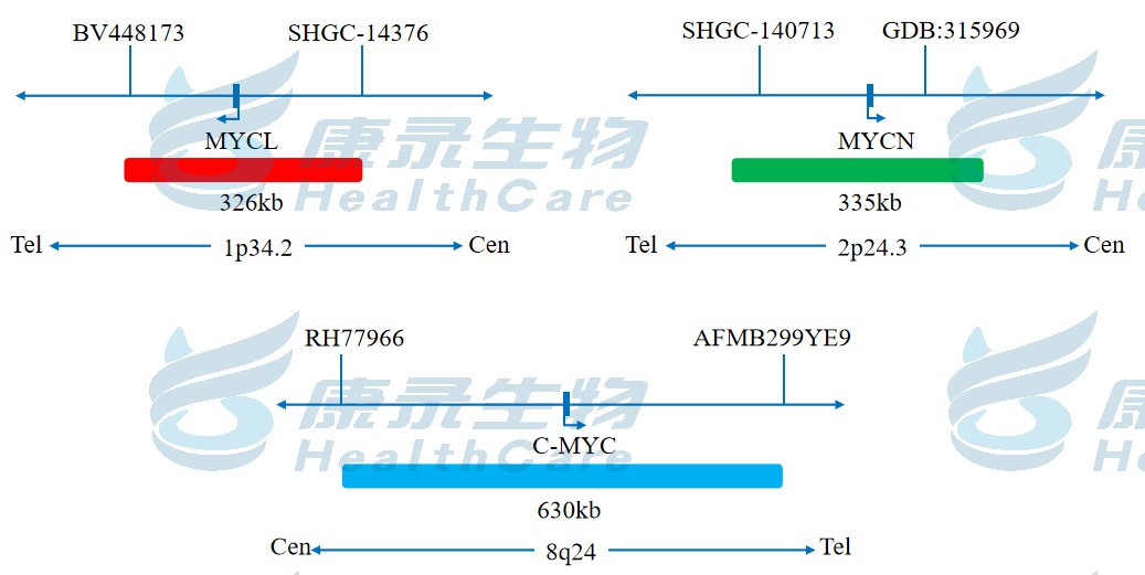 MYCL基因橘红色探针;MYCN基因绿色探针;MYC基因青色探针