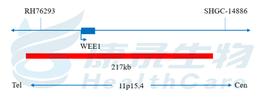 可用于检测 WEE1基因扩增及 WEE1基因所在染色体区域(如11p15)可能发生的重排。WEE1基因编码一种丝氨酸/苏氨酸蛋白激酶,是细胞周期G2/M检查点的核心调控因子,其通过磷酸化CDK1(Cyclin-Dependent Kinase 1)抑制细胞进入有丝分裂,确保DNA损伤修复完成。WEE1基因扩增可能导致蛋白过表达,与肿瘤增殖、侵袭性潜在相关。