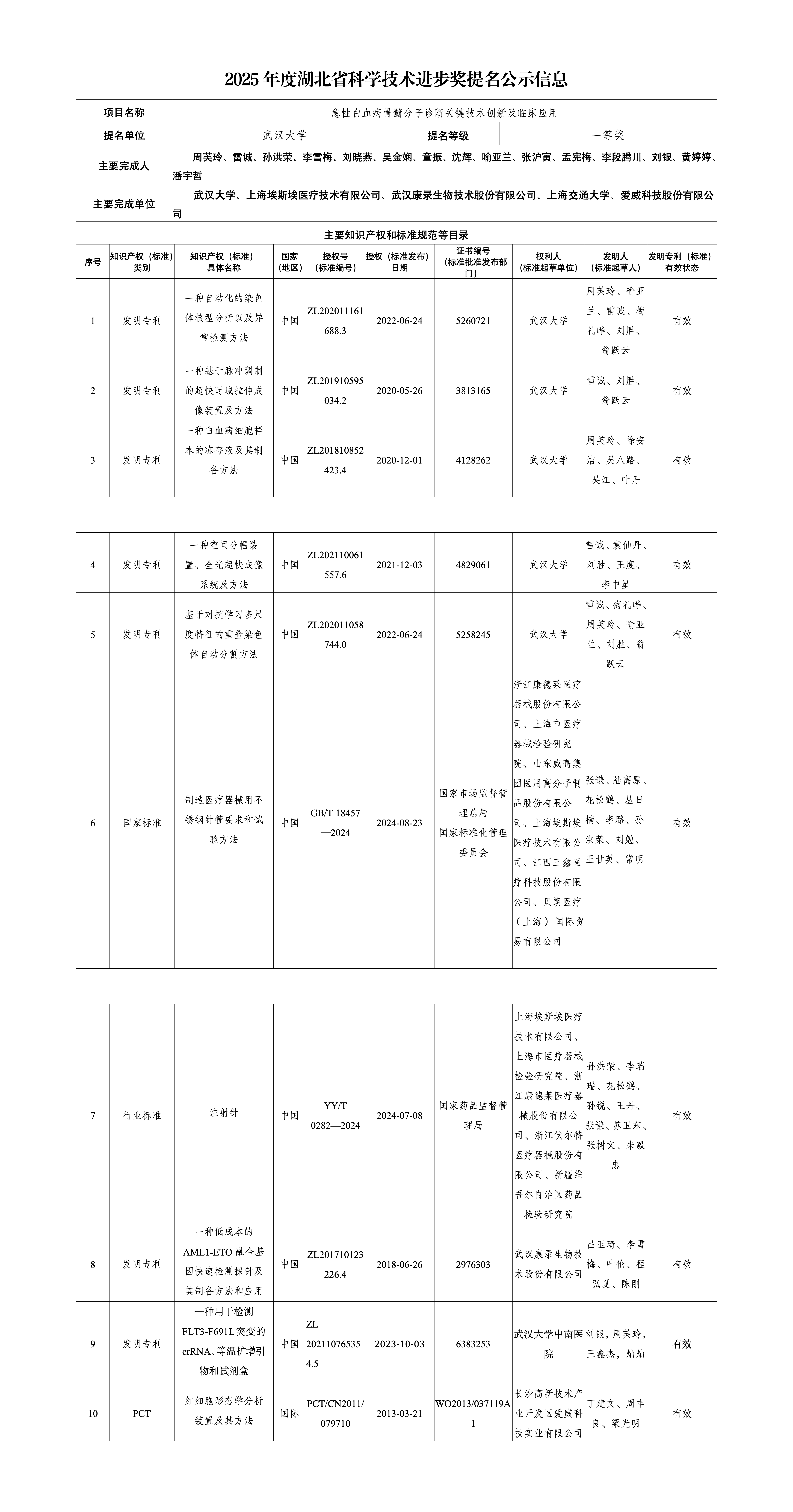 根据2025年度湖北省科学技术奖提名工作要求,现对我单位参与项目“急性白血病骨髓分子诊断关键技术创新及临床应用”相关资料进行书面公示。公示时间是2025年5月15日-2025年5月21日,公示期7天。公示期内如对公示内容有异议,请您向6776永利集团反映。