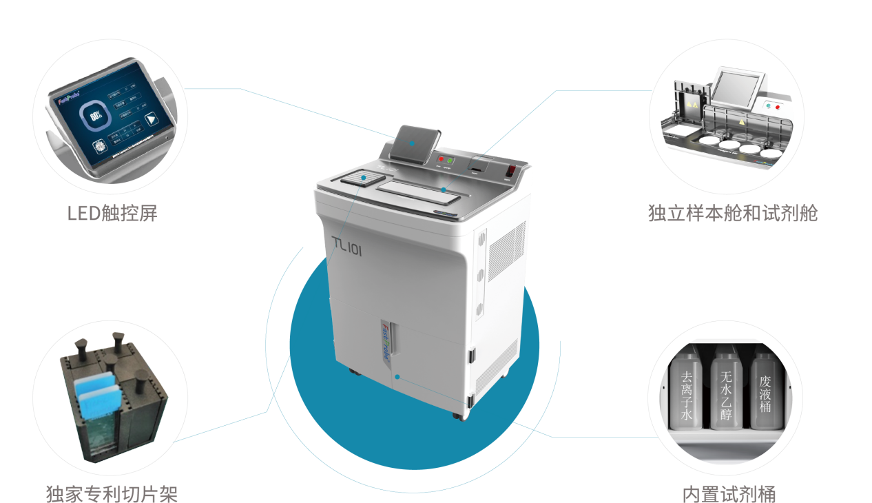 3小时全自动完成烤片、脱蜡、通透(水煮)、酶消化、脱水等FISH前处理步骤,集所有前处理相关设备和耗材于一体。